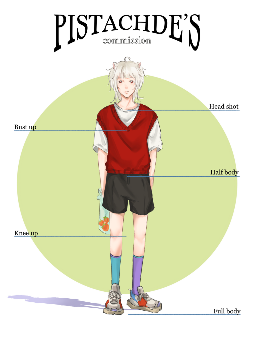(สามารถสอบถามก่อนได้หากไม่แน่ใจว่ารูปแบบของงานเป็นส่วนตัวหรือเชิงพาณิชย์)2. ลิขสิทธิ์ของภาพเป็นของผู้วาด ไม่อนุญาติให้แอบอ้างว่าวาดเองทุกกรณี3. ไม่อนุญาตให้นำผลงานไปลงช่องทาง NFT และ AI generator ใดก็ตาม4. นักวาดสามารถปฏิเสธรับงานของผู้ว่าจ้างได้ หากคิดว่าไม่สามารถทำงานได้5. จะไม่มีการคืนเงินใด ๆ หลังจากเริ่มว่าจ้างแล้ว ยกเว้นในกรณีที่นักวาดเป็นผู้ที่ไม่สามารถดำเนินงานต่อได้เอง6. ไม่อนุญาตให้ดัดแปลงผลงานโดยไม่ได้รับอนุญาต7. ขออนุญาตนำผลงานไปลงใน social media ต่าง ๆ เพื่อเป็นตัวอย่างคอมมิชชั่น อย่างไรก็ตามนักวาดจะขอความยินยอมจากผู้ว่าจ้างก่อนและติดลายน้ำทุกครั้ง8. ให้เครดิต pistachde ทุกครั้งเมื่อนำงานไปลงในที่สาธารณะหรือใช้งาน